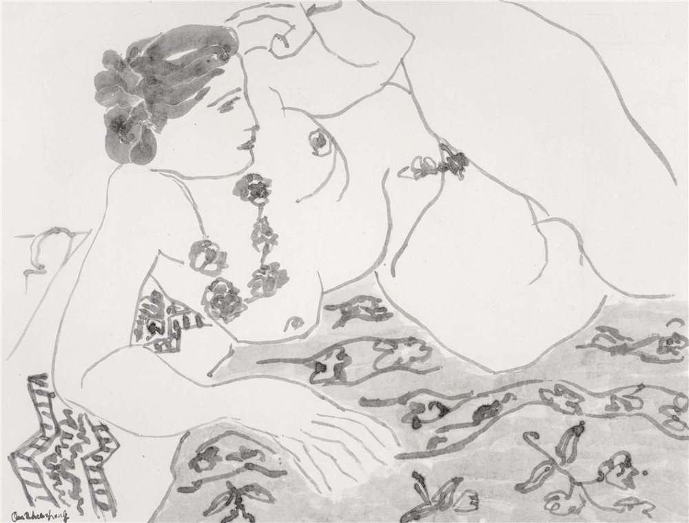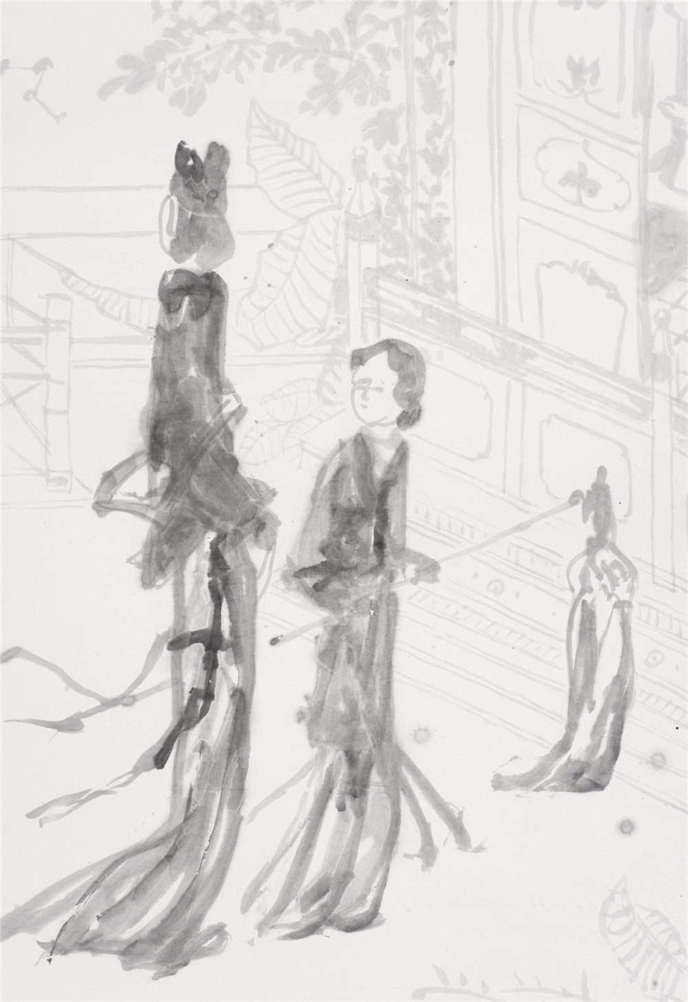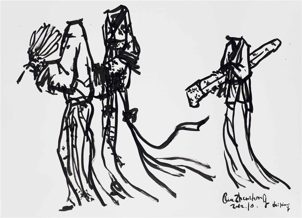 马蒂斯第一组画(图2、图3)和西厢记第一组画(图45)不改变原作的图形,把木刻线、钢笔线改写成我的风格的墨线;马蒂斯第二组画(图6),用泼墨、线条改写马蒂斯的油画作品;马蒂斯第三组画(图7),用毛笔线对油画、雕塑进行抽象化处理;西厢记第二组画(图8),用擦拭的方法,把传统图形改造成现代构图;西厢记第三组画(图9),把人物的脑袋擦去,只剩下衣饰在空气中飘行。