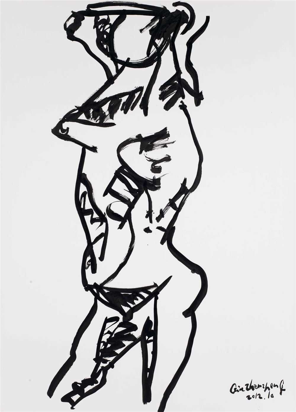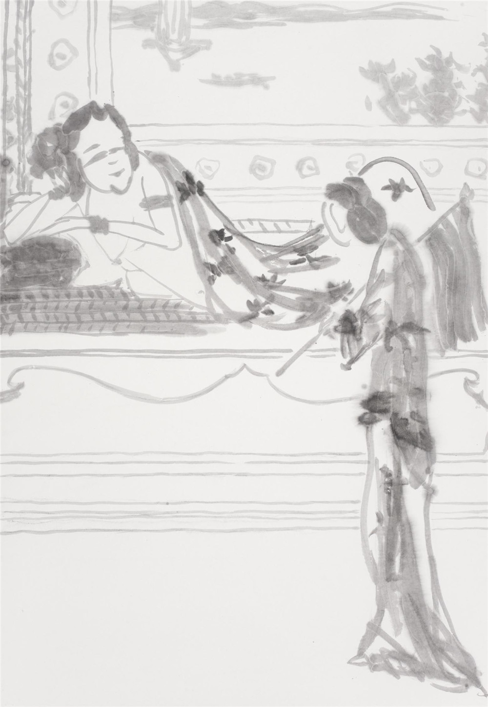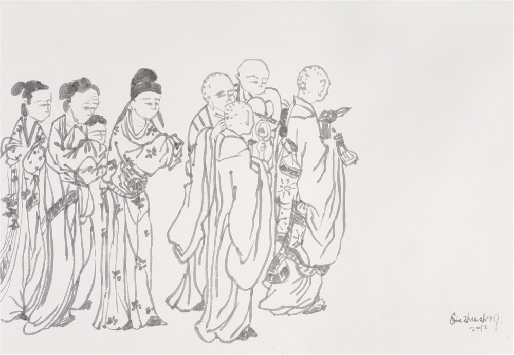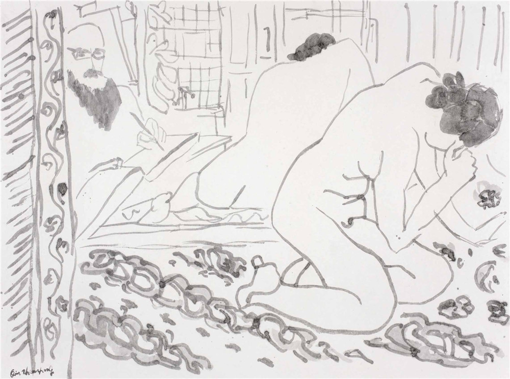 马蒂斯第一组画(图2、图3)和西厢记第一组画(图45)不改变原作的图形,把木刻线、钢笔线改写成我的风格的墨线;马蒂斯第二组画(图6),用泼墨、线条改写马蒂斯的油画作品;马蒂斯第三组画(图7),用毛笔线对油画、雕塑进行抽象化处理;西厢记第二组画(图8),用擦拭的方法,把传统图形改造成现代构图;西厢记第三组画(图9),把人物的脑袋擦去,只剩下衣饰在空气中飘行。