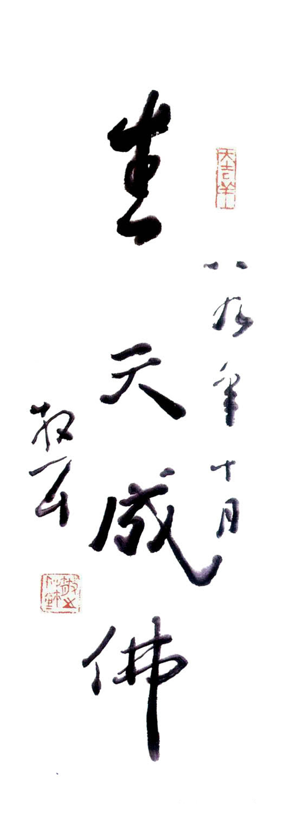 邱振中:你提出的第一个问题,我认为是“平淡”。至于你说的第二个问题,我觉得有几件事,第一件是他跟黄宾虹学习,这一点非常重要。从林散之的传记来看,他跟黄宾虹密切接触的时间并不是太多,也不太长,但是对他一生的影响重大。第二件是他出外游历,时间之长,遇到的危险之大,在艺术家里是少有的。尤其是在那种动乱的时期——是30年代中期吧?第三件是“文革”中没受什么冲击。这是很幸运的。第四件,是他去世前写的一幅字:天成佛(图1)。这是他的自我定位。一种暗示和自信。与别人截然不同。他一生的感觉,一生的精神状态——用现代的话说,就是“感觉的模式”,与中国的书法家、画家太不一样了。